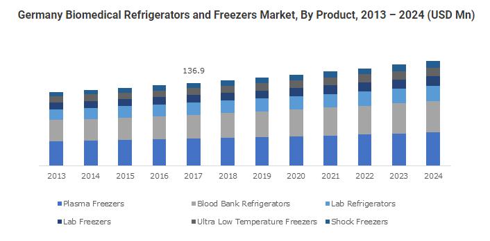 Plasma freezers product segment dominated the Europe biomedical refrigerators and freezers market with USD 245.7 million revenue in 2017 owing to increasing demand for plasma freezers in blood banks, diagnostic centers, biomedical research centers and hospitals for proper storage of red cells, platelet concentrates, cryoprecipitate and fresh frozen plasma (FFP).
