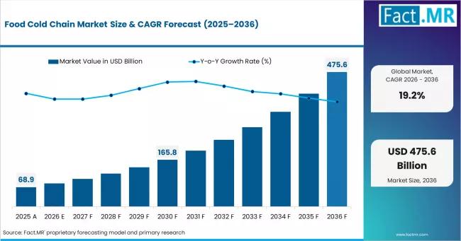 The global food cold chain market is projected to grow from USD 82.1 billion in 2026 to USD 475.6 billion by 2036, at an impressive CAGR of 19.2%. Key drivers include rising demand for refrigerated storage, meat and poultry supply chain expansion, and advanced cold chain technologies across emerging and developed regions.