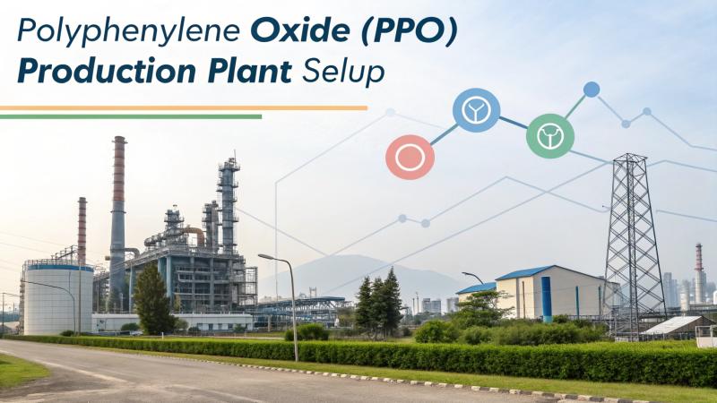 Setting up a polyphenylene oxide production plant involves selecting a suitable manufacturing method such as oxidative coupling polymerization of 2,6-dimethylphenol using copper-amine complex catalysts, securing raw material supply of phenolic monomers and catalyst systems, installing polymerization reactors, precipitation and washing units, compounding and pelletizing equipment, and solvent recovery systems, and ensuring compliance with environmental regulations and polymer quality standards.