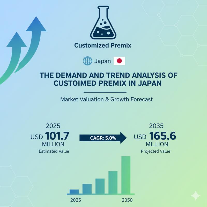 The Demand and Trend Analysis of Customized Premix in Japan is poised for consistent expansion, with the market estimated to reach USD 101.7 million in 2025 and projected to climb to USD 165.6 million by 2035, reflecting a steady 5.0% CAGR. This growth underscores Japan's evolving nutrition landscape, where personalization, preventive wellness, and ingredient innovation are shaping next-generation food and supplement solutions.