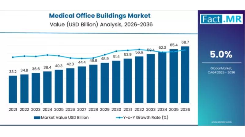 The global medical office buildings market is set for steady and sustained growth, driven by the rapid expansion of outpatient care services, rising healthcare expenditure, and increasing demand for accessible, patient-centric medical facilities. According to Fact.MR, the market is valued at USD 42.3 billion in 2026 and is projected to reach USD 68.7 billion by 2036, registering a compound annual growth rate (CAGR) of 5.0% between 2026 and 2036.
