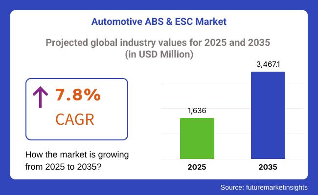 The global Automotive Anti-lock Braking System (ABS) and Electronic Stability Control (ESC) market is set for unprecedented growth, projected to surge from USD 1,636.0 million in 2025 to USD 3,467.1 million by 2035, expanding at a robust CAGR of 7.8%. This growth is fueled by stringent safety regulations, technological advancements, and rising consumer demand for enhanced road safety, alongside the accelerating adoption of electric and autonomous vehicles (EVs and AVs).