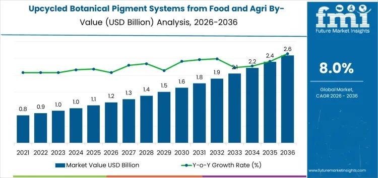 The global upcycled botanical pigment systems from food and agri by-products market is entering a decisive growth phase as sustainability moves from aspiration to operational priority across food, beauty, and textile value chains. Valued at USD 1.2 billion in 2026, the market is forecast to reach USD 2.6 billion by 2036, expanding at a compound annual growth rate (CAGR) of 8%. The acceleration reflects rising consumer demand for natural colorants,