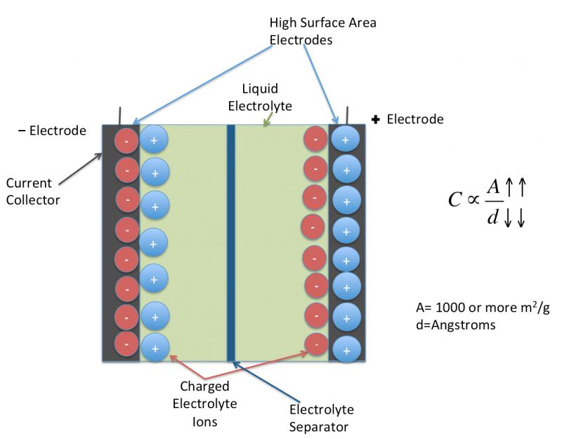 Electric Double Layer Capacitor is electrochemical capacitors which energy storage predominant is achieved by Double-layer capacitance. Double-layer capacitance electrostatic storage of the electrical energy achieved by separation of charge in a Helmholtz double layer is at the interface between the surface of a conductor electrode and an electrolytic solution electrolyte.