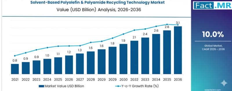 The global transition toward circular plastics is accelerating, and solvent-based polyolefin (PO) and polyamide (PA) recycling technologies are emerging as a cornerstone of next-generation materials recovery. The global solvent-based polyolefin & polyamide recycling technology market is projected to grow from approximately USD 1.21 billion in 2026 to USD 3.14 billion by 2036, expanding at a robust compound annual growth rate (CAGR) of 10.0% over the forecast period.