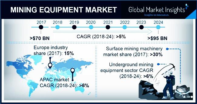 Mining Equipment Market is expected to be around USD 100 billion by 2024. Increasing investments in developing innovative and smart solutions will drive the mining machinery market. Rising demand for advanced extraction solutions is encouraging the players to increase their R&D activities to cater to the requirement of the customers.The industry is witnessing a growing demand for connected technologies for monitoring the industrial processes. Several players are engaged in developing IoT-based equipment for remote monitoring and control. It was estimated that around 40% of the manufacturers in the industry are planning to implement IoT-connected technologies for performing extraction activities.