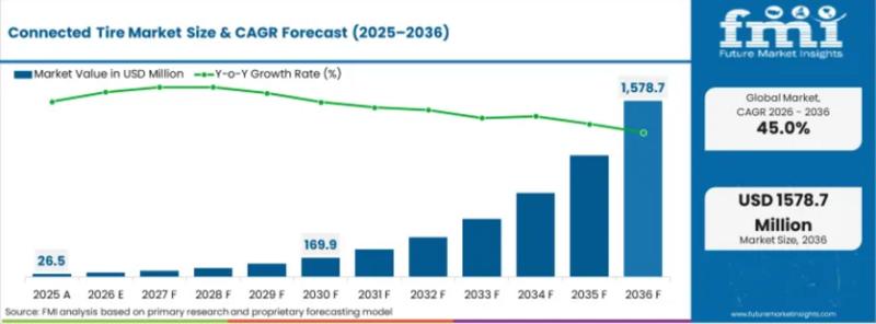According to the latest analysis by Future Market Insights, the global connected tire market is entering an exponential growth phase as automotive and logistics ecosystems transition toward data-driven operations. The market is valued at USD 38.42 million in 2026 and is projected to reach USD 1.58 billion by 2036, expanding at a CAGR of 45.0%. The sector is expected to generate an incremental opportunity of USD 1.54 billion over the…