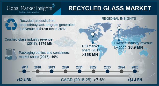 According to a new research report by Global Market Insights, Inc. Recycled Glass Market size will surpass USD 4.4 billion by 2025.Recycled glass is a sustainable material providing boundless ecological aids including contribution to mitigating climate change and saving valuable natural resources as vitric products can be recycled in close loop endlessly. On an average, the glass bottle has a recycling rate of 50% to 80% which conserve a significant amount of raw material. The use of product during the manufacturing of vitric products will also conserve the energy consumption as the cullet melt at a lower temperature than raw material.
