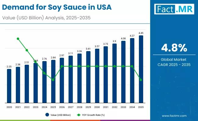 The United States' demand for soy sauce is expected to expand by USD 1.61 billion over the course of the forecast period, from USD 2.84 billion in 2025 to over USD 4.45 billion by 2035. Demand is expected to grow at a compound annual growth rate (CAGR) of 4.80% between 2025 and 2035, resulting in a total growth of 56.7%.