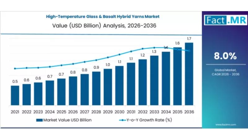 The global high-temperature glass & basalt hybrid yarns market is set for strong expansion, driven by rising demand for advanced composite materials across aerospace, automotive, construction, and industrial insulation applications. According to industry analysis, the market valuation is projected to grow from USD 0.78 billion in 2026 to USD 1.68 billion by 2036, registering a steady CAGR of 8.0% during the forecast period. This growth represents a total market expansion