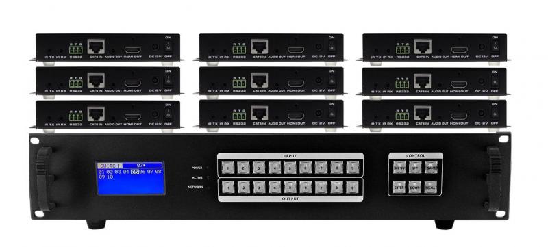 The WolfPack 9x9 HDMI Matrix HDBaseT Router manages HDMI input signals for the inputs and HDBaseT CATx cabling for the output. This 9x9 HDMI Matrix HDBaseT Router support long haul transmission, maintains power reliability in the event of failure and offer the best flexible solutions for an AV system deployment. Our 9x9 HDMI Matrix HDBaseT Router also can support high-resolution HDMI sources routed to HDMI displays, monitors, projectors, or audio receivers, etc. The EDID can be selected between seven different modes or copied from the attached displays.