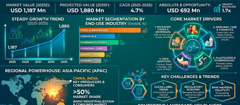 According to Fact MR's latest analysis, The global benzoic acid market is entering a phase of steady and strategic expansion, projected to grow from USD 1,147 million in 2024 to USD 1,880 million by 2035, registering a CAGR of 4.7% during the forecast period (2025-2035). The market is expected to create an absolute dollar opportunity of USD 692 million, driven by increasing applications across food preservation, pharmaceuticals, and sustainable industrial…