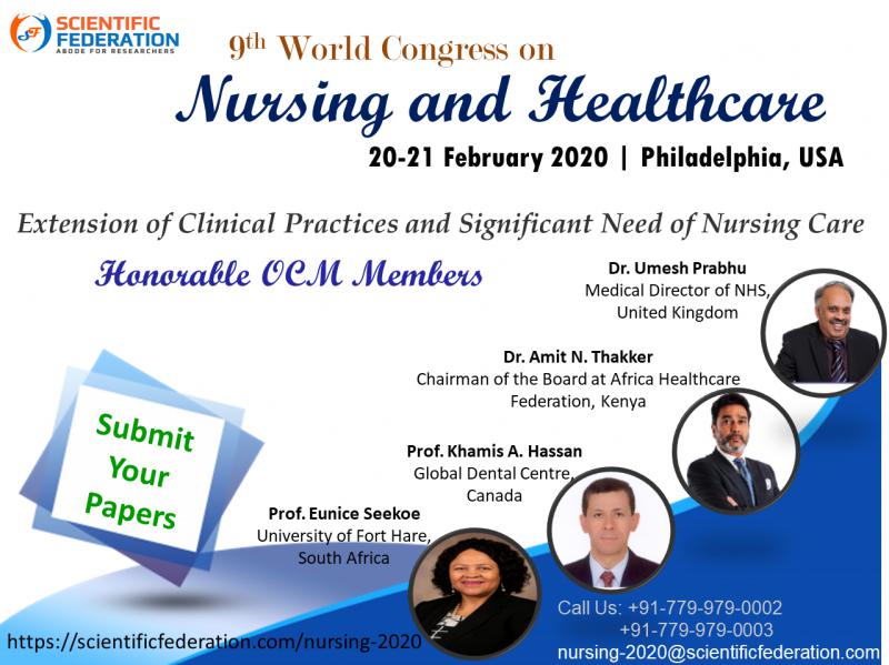 9th World Congress on Nursing and Healthcare held in Philadelphia, USA during 20th and 21st February 2020 with the theme"Extension of Clinical Practices and Significant Need of Nursing Care". World Congress on Nursing and Healthcare provides you an amazing chance to listen to vary of Healthcare topics across the industry. It's an intimate platform to have interaction along with your peers, hear concerning new trends and innovation and interact with vendors from startups up to established within the same domain. This is often the place to grasp to know about the newest and greatest that's happening around the world to make healthcare better.World Congress on Nursing and Healthcare is a podium for nursing students, faculty, deans, researchers, and privileged to team up on topics affecting nursing and Healthcare education. Nursing-2020 will have 5-6 world level (Highly cited class) plenary speakers, established Keynote speakers, workshops, symposium, active Invited speakers and fresh contributed speakers. In addition, a variety of poster presentations along with workshops and special sessions would be interested in the audience.