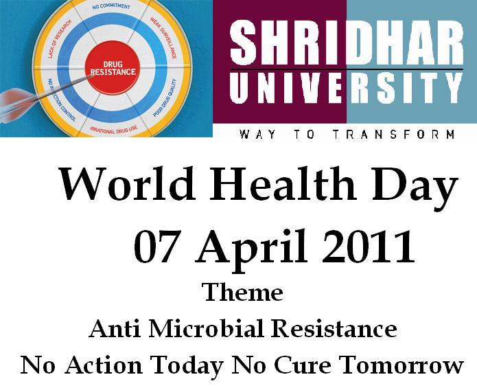 On this occasion, Prof BR Natarajan Pro Vice Chancellor on April 7, 2011 addressed the faculty and students of Way to Transform Shridhar University Pilani and highlighted the various issues pertaining to anti microbial resistance including the WHO recommended policy steps. Pointing out that AMR can be due to reasons such as inappropriate use of medicine, taking substandard doses or by not finishing a prescribed course of treatment, use of low-quality medicine, wrong prescriptions etc; Prof Natarajan urged them to spread the message of AMR to the public at large.