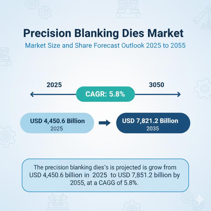 The global precision blanking dies market is entering a transformative growth phase, expected to expand from USD 4,450.6 billion in 2025 to USD 7,821.2 billion by 2035, achieving a compound annual growth rate (CAGR) of 5.8%. With steady year-on-year gains and a projected 75.7% expansion over the decade, the market is positioning itself as a backbone of modern industrial production, particularly in automotive, consumer electronics, and advanced manufacturing sectors.