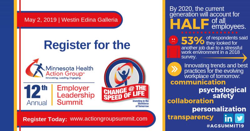 BLOOMINGTON, MN (April 18, 2019) ⎯ The pace of change in health care is fast and furious. And high-performing companies are working hard to keep up by creating purpose-driven work environments that attract and retain top talent across demographic groups. The Minnesota Health Action Group’s 12th Annual Employer Leadership Summit on May 2 will address how the changing workforce — as well as the physical workplace — are influencing the type of benefits employers offer.Employers, business leaders, human resource professionals, and health care companies will benefit from Minnesota-based and nationally known speakers who will provide inspiration, actionable insights, and tools to help employers address the health and well-being needs of the workforce of the future. Summit attendees will also receive an exclusive sneak peek at findings from the Minnesota Health Action Group’s Annual Employer Benefits Survey, which tracks benefit trends from public and private entities that are headquartered in and have employees in Minnesota. Official survey results won’t be released until mid-May, giving Summit attendees early access to valuable trend information that can influence benefit design.