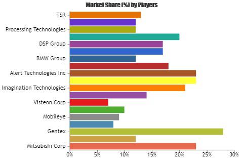 • Market Share & Sales Revenue by Key Players & Emerging Regional Players. [Some of the players covered in the study are Mitsubishi Corp, Toshiba Corporation, Gentex, Delphi Corporation, Mobileye, Denso Corporation, Visteon Corp, Bosch, Imagination Technologies, ARM Ltd., Alert Technologies Inc, ERS Group, BMW Group, ECOSYS Group, DSP Group, Sense Technologies LLC, Processing Technologies, Autoliv & TSR]