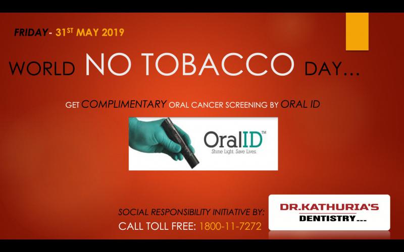 On World No Tobacco Day, Dr. Kathuria’s Dentistry is offering a complimentary oral cancer screening in association with OralIDTM. The purpose of the initiative is to spread awareness among the public on oral cancer; and also to make people conscious of their oral health by detecting oral cancer using Forward Science’s OralID - Shine Light. Save Lives.Oral Cancer is one of the most common diseases in today’s world. In India itself the Age Adjusted rates is around 64.8 for mouth cancer among both females and males. Oral cancer can be caused due to multiple factors including chewing of tobacco and consumption of alcohol.