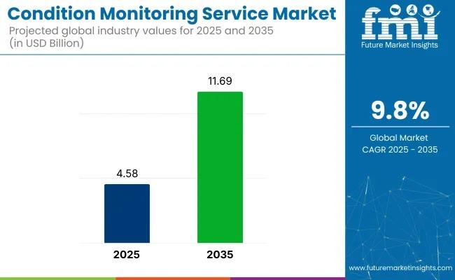 The global condition monitoring service market is poised for robust expansion through 2035, driven by Industry 4.0 adoption, IoT integration, and the imperative for equipment reliability amid rising industrial complexity. According to Future Market Insights (FMI), the market is valued at USD 4.58 billion in 2025 and is projected to hit USD 11.69 billion by 2035, advancing at a compound annual growth rate (CAGR) of 9.8%.