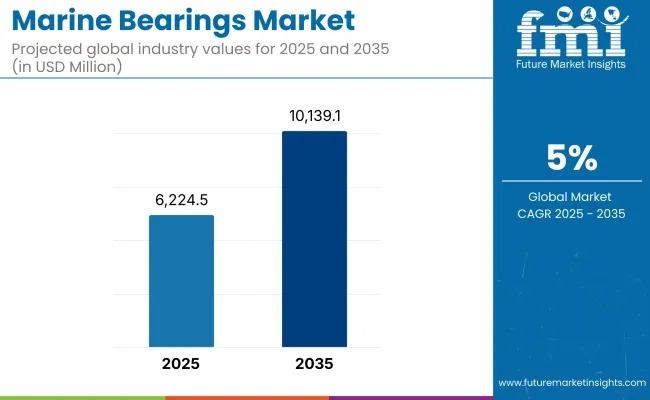 The global marine bearings market is poised for robust expansion through 2035, fueled by rising seaborne trade, offshore renewable projects, and the shift to eco-friendly propulsion systems. According to Future Market Insights (FMI), the market is valued at USD 6,224.5 million in 2025 and is projected to reach USD 10,139.1 million by 2035, expanding at a compound annual growth rate (CAGR) of 5%.