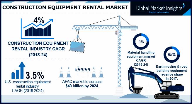 Asia Pacific Construction Equipment Rental Market is expected to reach over USD 40 billion by 2024. The emerging trend of the organizations toward renting of heavy construction equipment will have a positive impact toward the industry demand. Rising wage rates in China coupled with the changing consumption patterns are generating a huge demand for the rental machinery.Construction Equipment Rental Market to cross $140 billion by 2024. The rise in the construction of commercial and residential infrastructures is anticipated to drive the construction equipment rental market over the forecast timeline. Government institutions across various regions are making heavy investments on new construction projects as well as reconstructing the existing structures.