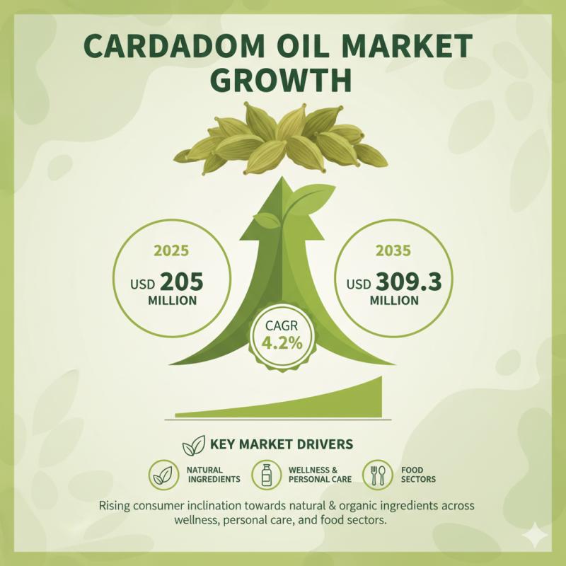 The global cardamom oil market is projected to rise from USD 205 million in 2025 to USD 309.3 million by 2035, registering a CAGR of 4.2%, supported by growing consumer preference for natural and organic ingredients across food, wellness, aromatherapy, and personal care sectors.