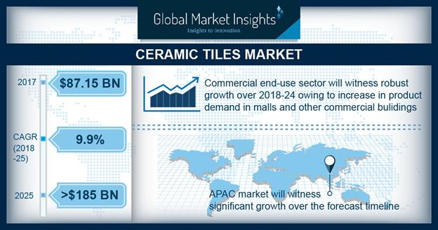 Asia Pacific will be expanding with substantial gains in global ceramic tiles market over the forecast duration. Rising construction activities in China, South Korea, India and Japan are likely to fuel ceramic tiles market growth during the forecast timeframe. Drifting consumer preference from metal slabs, marble floors, paints and other home decorations to ceramic tiles will be driving regional ceramic tiles demand over the next few years.Global Ceramic Tiles Market is forecast to exceed USD 185 billion; according to a new research report. Advancing manufacturing technology and experiments of digital prints into ceramic tiles will be largely driving product demand in the coming years. Introduction of digitalization into ceramic tiles production has led to convenience in producing a variety of colors and several combinations for providing aesthetics to floors and walls. Digital manufacturing includes rendering which can vary random designs from tile to tile.