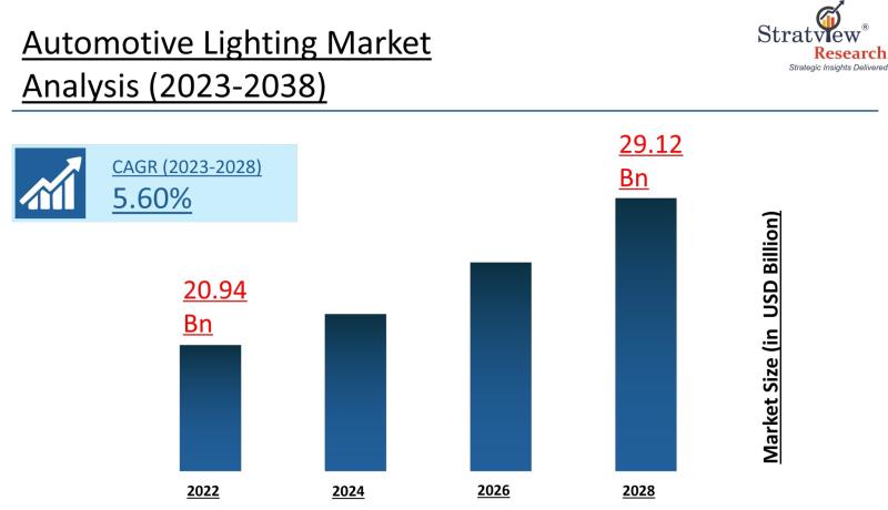 The Automotive Lighting Market encompasses lighting and signaling systems used in vehicles to enhance visibility, safety, and aesthetics across front, rear, side, and interior applications. The market is projected to reach USD 29.12 billion by 2028, growing from USD 20.94 billion in 2022 at a CAGR of 5.60% during 2023-2028.
