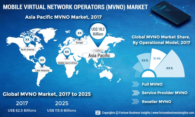 The Global Mobile Virtual Network Operators Market to gain from increasing collaborations between mobile virtual network operators (MVNO) and mobile network operators. Recently Fortune Business Insights, published a report, titled “Mobile Virtual Network Operators (MVNO) Market Size, Share and Global Trend by Operational Model (Reseller MVNO, Service Provider MVNO, Full MVNO), Service Type (Postpaid, Prepaid), Subscriber (Business, Individual/Residential) and Geography Forecast till 2025.” As per the report the global mobile virtual network operators market stood at US$ 62.5 Bn in 2017. It is expected to expand at a CAGR of 7.8% and reach US$ 113.9 Bn by the end of 2025.Browse Complete Report https://www.fortunebusinessinsights.com/industry-reports/mobile-virtual-network-operators-market-100076