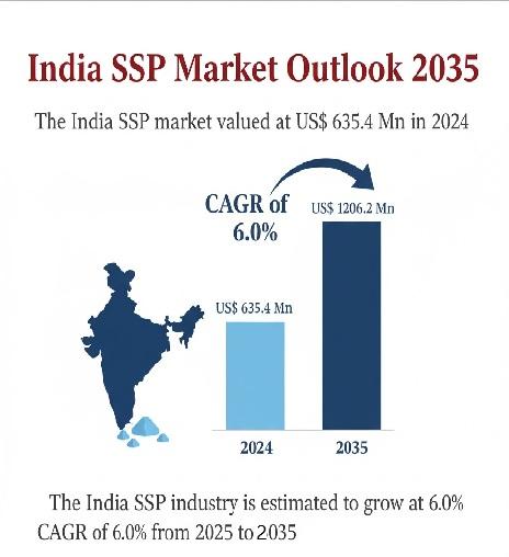 The India SSP market was valued at US$ 635.4 million in 2024 and is projected to grow at a CAGR of 6.0% from 2025 to 2035, reaching approximately US$ 1,206.2 million by 2035. The market is driven by the increasing demand for phosphate-based fertilizers, government support for sustainable agriculture, and the critical role of SSP in enhancing crop productivity across varied soil types.