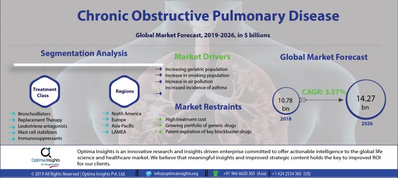 The Chronic Obstructive Pulmonary Disease (COPD) was valued at US $10.78 billion in the year 2018 and is estimated to reach US $14.27 billion by 2026, at a CAGR of 3.57%.Chronic Obstructive Pulmonary Disease (COPD) is a chronic inflammatory lung disease that causes airflow obstruction and breathing difficulties. COPD is characterized by emphysema, chronic bronchitis, and refractory (non-reversible) asthma. Further, COPD symptoms include frequent coughing, increased breathlessness, wheezing and tightness in the chest.