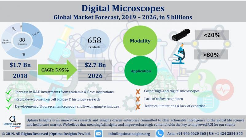 The Digital Microscope Market was valued at US$1.7 billion in the year 2018 and is estimated to reach US$2.7 billion by 2026, at a CAGR of 5.95%.
