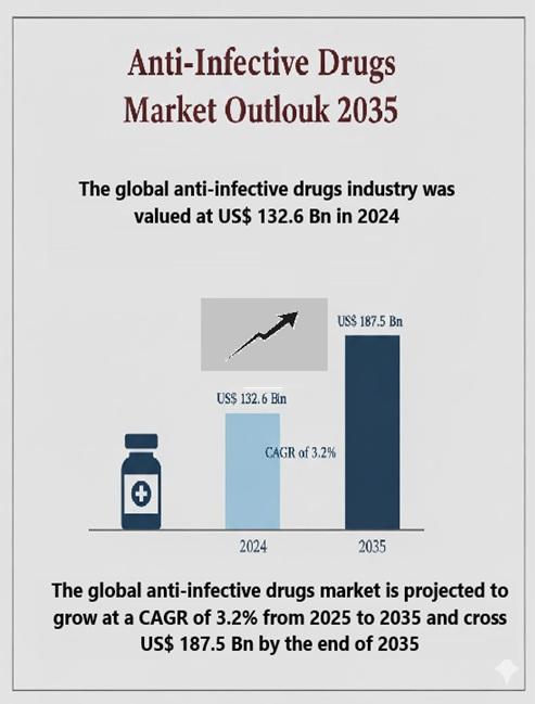 The global anti-infective drugs market was valued at US$ 132.6 billion in 2024 and is projected to grow at a CAGR of 3.2% from 2025 to 2035, reaching US$ 187.5 billion by the end of 2035. The market's steady growth is driven by rising incidences of infectious diseases, growing antimicrobial resistance (AMR), and increasing demand for innovative antiviral, antibacterial, and antifungal therapies.