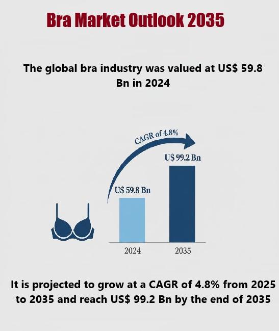 The global bra market was valued at US$ 59.8 billion in 2024 and is projected to grow at a CAGR of 4.8% from 2025 to 2035, reaching nearly US$ 99.2 billion by the end of 2035. This steady growth is driven by evolving consumer preferences, rising awareness about body comfort, and the increasing integration of technology and sustainability in lingerie design.