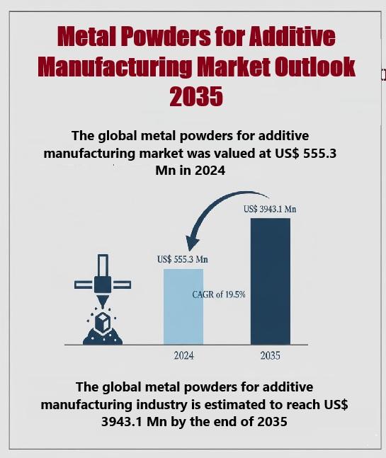 The global metal powders for additive manufacturing market was valued at US$ 555.3 million in 2024 and is projected to grow at an impressive CAGR of 19.5% from 2025 to 2035, reaching US$ 3,943.1 million by the end of 2035. This rapid growth reflects the expanding adoption of 3D printing technologies across industries such as aerospace, automotive, healthcare, energy, and defense.