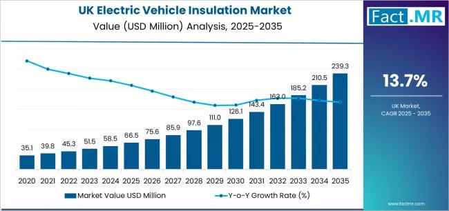 The UK's demand for electric vehicle insulation is expected to increase at a compound annual growth rate (CAGR) of 13.7% between 2025 and 2035, from USD 66.5 million in 2025 to over USD 239.3 million by that time.