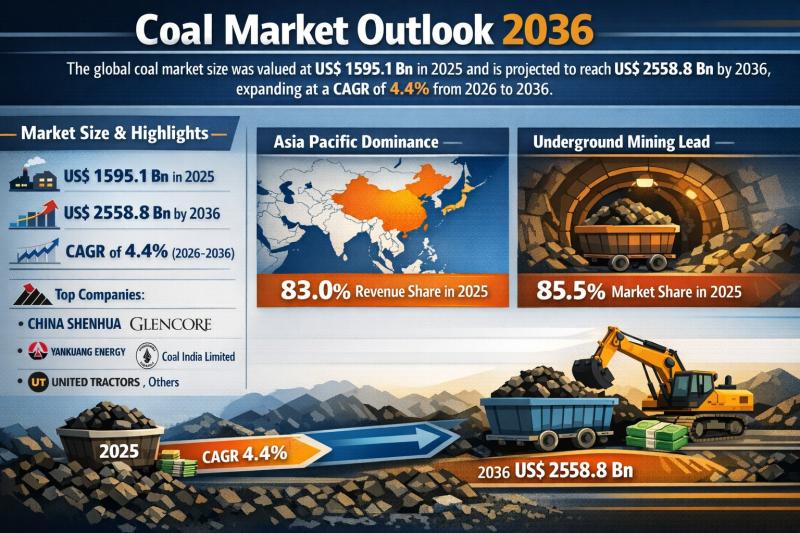The global coal market was valued at US$ 1,595.1 Bn in 2025 and is projected to reach US$ 2,558.8 Bn by 2036, expanding at a CAGR of 4.4% from 2026 to 2036. The industry continues to remain a cornerstone of global energy systems, particularly in emerging economies where coal-fired power generation supports industrialization and infrastructure growth.