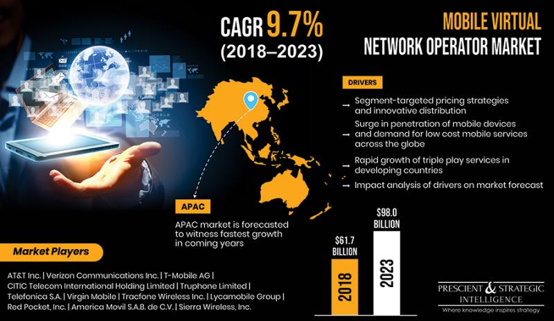 In 2018, the mobile virtual network operator (MVNO) market generated $61.7 billion and is projected to witness a 9.7% CAGR during 2018-2023. This is due to the rapid growth of triple play services in developing countries, segment-targeted pricing strategies and innovative distribution, and increasing penetration of mobile devices and demand for low cost mobile services. Mobile service providers who do not own licensed spectrum and cellular network infrastructure but buy wireless network infrastructure services at wholesale prices from mobile network operators for reselling it to customers at a reduced price are called MVNOs.Get the Sample Copy of this Report @ https://www.psmarketresearch.com/market-analysis/mobile-virtual-network-operator-market/report-sample