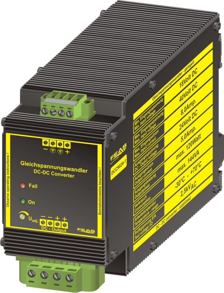 FEAS offers the shock and vibration resistant DC/DC converter series DCC90 for the use under rough conditions. The converters for DIN rail or wall mounting supply up to 120 W output power and are usable in a temperature range of -30 to +70 ° C. The complete encapsulation in resin provides optimum protection against moisture and dirt safely of the electronics in the full aluminium casing.FEAS provides versions for the input voltage range 18 to 40 V, 30 to 80 V and 70 to 155 V and output voltages of 12 V, 24 V and 48 V. The converter DCC90 are short circuit proof and overload- and open circuit protected. For the future expansion of performance can the converter be connected in parallel. The correct operation is shown by a LED-indicator.