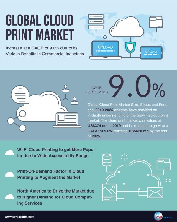 Los Angeles, February 18, 2020 - In a recent report by QY Research, titled, "Global Cloud Print Market Size, Status and Forecast 2019-2025" analysts have provided an in-depth understanding of the growing cloud print market. The cloud print market was valued at US$374 mn in 2019 and is expected to grow at a CAGR of 9.0% reaching US$628 mn by the end of 2025.Other key players to drive the global cloud printing market include Google, Microsoft, Baidu, Aliyun, VMWare, HP, Synergetic Data Systems, ThinPrint Cloud Services, and Celiveo.