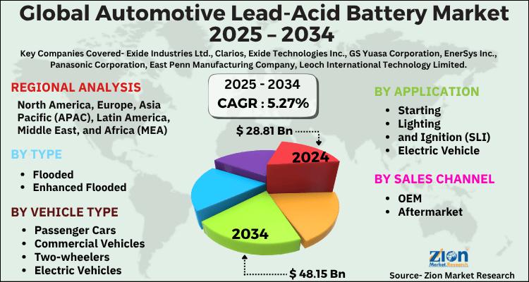 The global automotive lead-acid battery market, valued at USD 28.81 billion in 2024, is projected to reach USD 48.15 billion by 2034, growing at a 5.27% CAGR from 2025-2034.