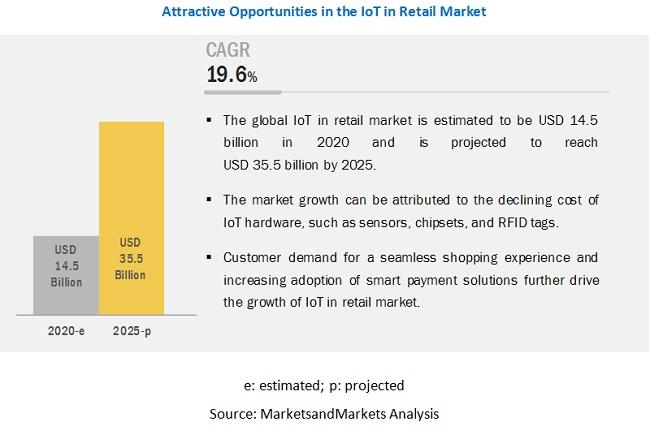 According to a new market research report "Internet of Things (IoT) in Retail Market by Platform (Device Management and Application Enablement), Hardware, Service, Application (Smart Shelf, Asset Management, Customer Experience Management, and Geomarketing), and Region - Global Forecast to 2025", published by MarketsandMarkets(TM), the IoT in Retail Market to grow from USD 14.5 billion in 2020 to USD 35.5 billion by 2025, at a Compound Annual Growth Rate (CAGR) of 19.6% during the forecast period.Major factors expected to drive the growth of the IoT in retail market include rapidly declining cost of IoT-based sensors and connectivity, increasing adoption of smart payment solutions, and customer demand for a seamless shopping experience.