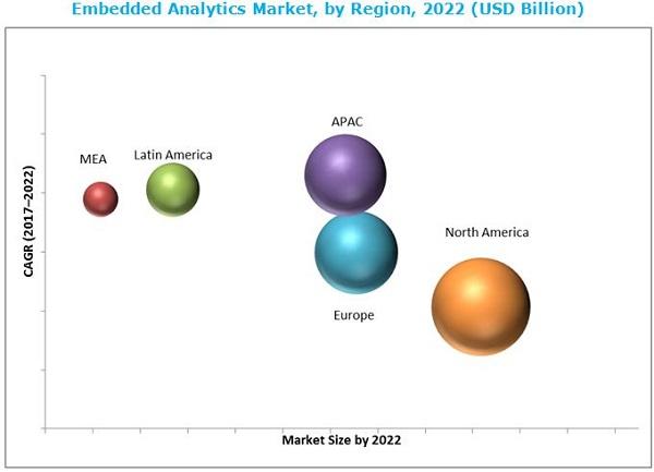 North America is expected to hold the largest share of the embedded analytics market in 2017, due to the technological advancements and early adoption of analytical solutions in this region. The market size in Asia Pacific (APAC) is expected to grow at the highest CAGR from 2017 to 2022. The primary driving forces for this growth are the increasing technological adoption and huge opportunities across industries in the APAC countries, especially in India, China, and Japan.