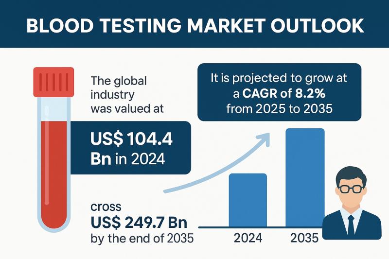The global Blood Testing Market is projected to grow from US$ 104.4 billion in 2024 to over US$ 249.7 billion by 2035, registering a strong CAGR of 8.2% during 2025-2035, according to the latest industry report. Growth is being driven by the escalating prevalence of chronic diseases, technological advances in point-of-care (POC) testing and lab automation, and expanding adoption of blood-based diagnostics in preventive and personalized medicine.