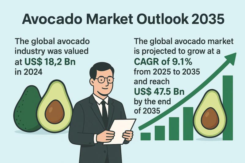 The global Avocado Market is forecast to grow from US$ 18.2 billion in 2024 to US$ 47.5 billion by 2035, expanding at a robust CAGR of 9.1% between 2025 and 2035. According to the latest analysis, this surge is being fueled by the global shift toward plant-based diets, increasing consumer demand for nutrient-rich foods, and advancements in supply chain and processing technologies.