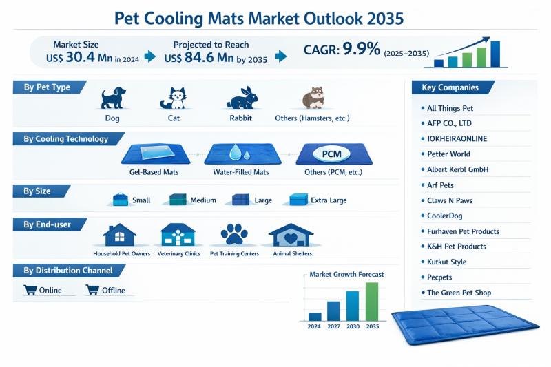 The global Pet Cooling Mats Market is witnessing robust growth as pet owners increasingly prioritize comfort, wellness, and heat protection for companion animals. Valued at US$ 30.4 Mn in 2024, the market is projected to reach US$ 84.6 Mn by 2035, expanding at a strong CAGR of 9.9% from 2025 to 2035. This growth trajectory reflects the convergence of rising pet ownership, humanization of pets, heightened awareness of heat-related pet…