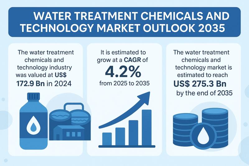 Water Treatment Chemicals and Technology Market is poised for significant expansion, growing from US$ 172.9 billion in 2024 to an estimated US$ 275.3 billion by 2035, registering a CAGR of 4.2% during the forecast period (2025-2035). The market's growth is being propelled by the global water scarcity crisis, increasing industrial compliance regulations, and advancements in water treatment technologies that ensure sustainability, safety, and efficiency across industries.