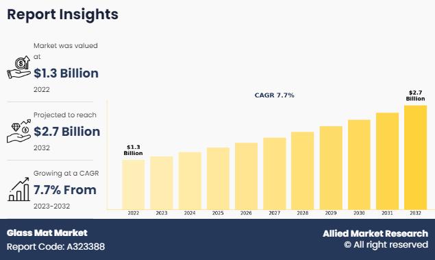 According to the report, the "Glass Mat Market" was valued at $1.3 billion in 2022, and is estimated to reach $2.7 billion by 2032, growing at a CAGR of 7.7% from 2023 to 2032.