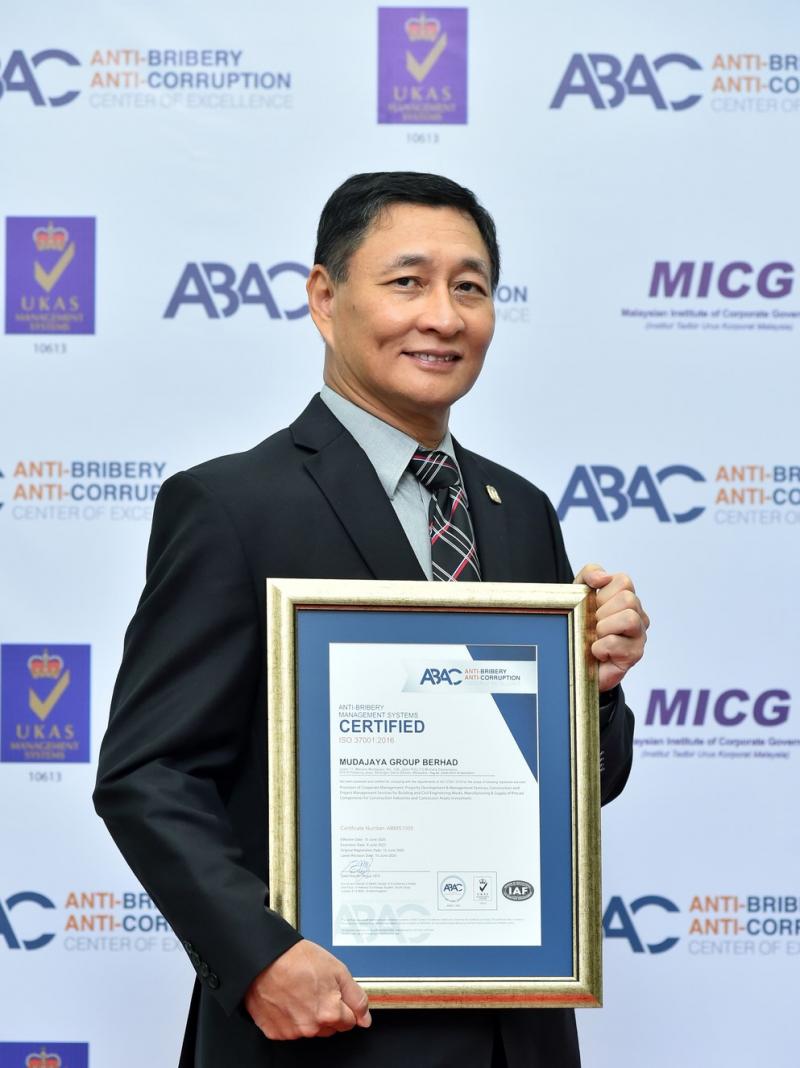 Ir. James Wong Tet Foh, Mudajaya Group Managing Director & CEO is showing the certification for for ISO37001:2016 ABMS
