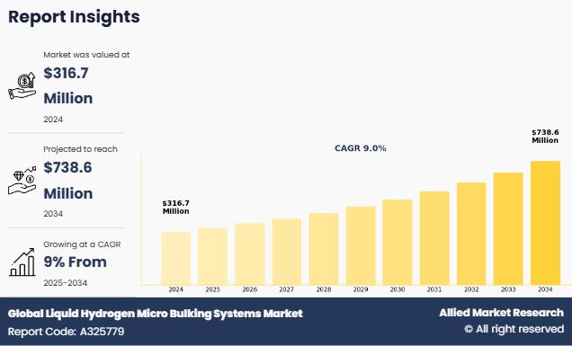 According to a new report published by Allied Market Research, the global liquid hydrogen micro bulking systems market was valued at $316.7 million in 2024 and is projected to reach $738.6 million by 2034, growing at a CAGR of 9.0% from 2025 to 2034. This growth reflects rising investments in hydrogen infrastructure and increasing adoption of liquid hydrogen across multiple industrial and energy applications.